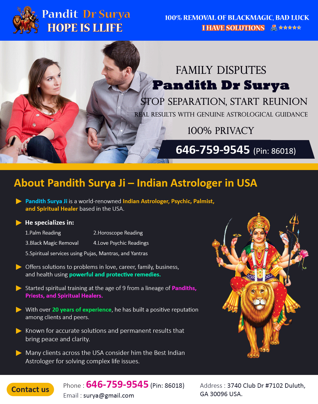 I am one of the most distinguished Astrologers in Duluth, GA. I specialize in Black Magic Remedy Experts,Face Reading Specialist,Gemologist,Horoscope Services,Nadi Astrology,Numerology,Prasanna Jothidam Astrology,Vastu Specialist,Vedic Astrology,Lal Kitab Expert,Kundali Reading,Panchang Reading.